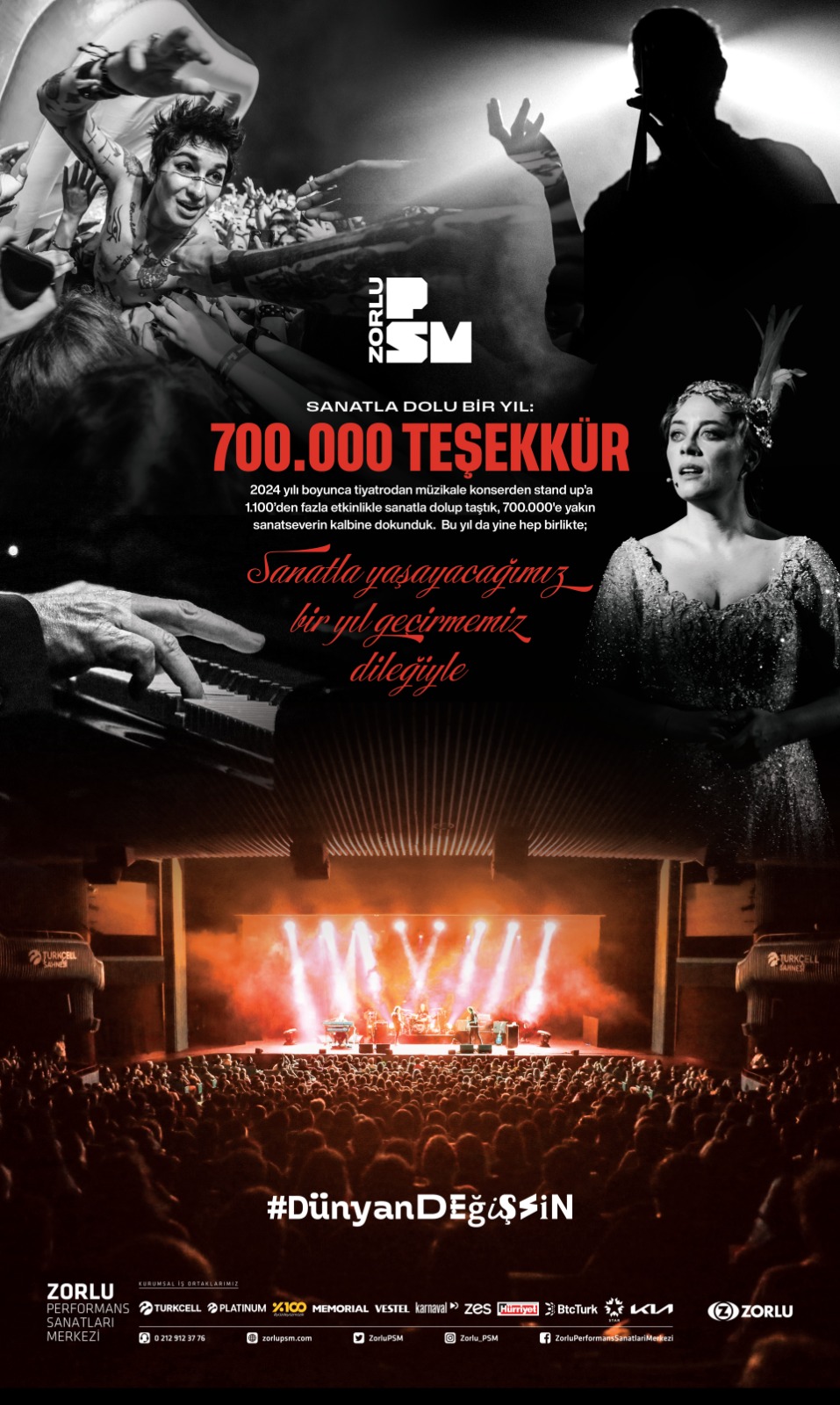 Zorlu PSM, 'Dünyan Değişsin' mottosuyla 12'nci sezonuna devam ettiği 2024 yılında 610’un üzerinde tiyatro ve konser, 3 festival, yüzlerce talk-show, stand-up, söyleşi, parti ve kurumsal etkinlik ile toplamda 1.100’den fazla etkinlikte 700 bine yakın sanatseveri ağırladı.