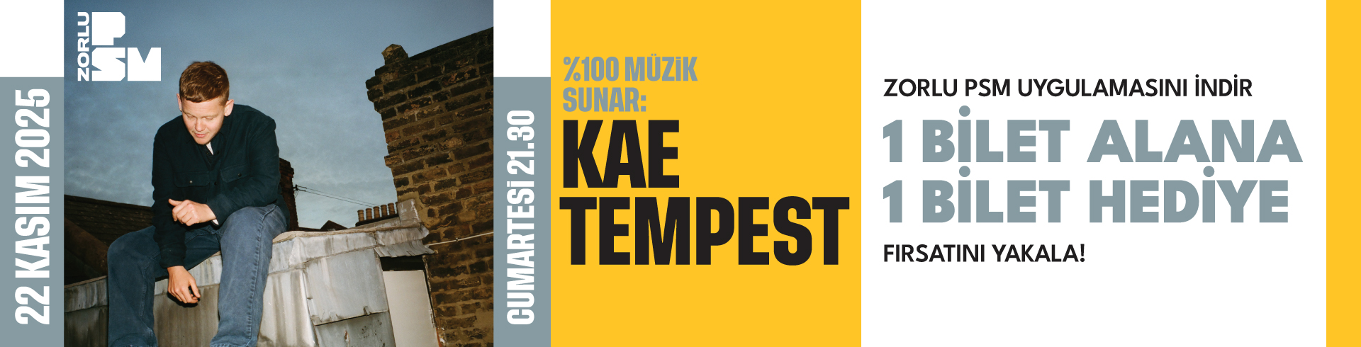 Zorlu PSM uygulamasını indir, kampanya kodunu aktive et ve 22 Kasım Cumartesi günü Turkcell Sahnesi'nde gerçekleşecek olan %100 Müzik Sunar: Kae Tempest konseri için 1+1 fırsatını yakala!