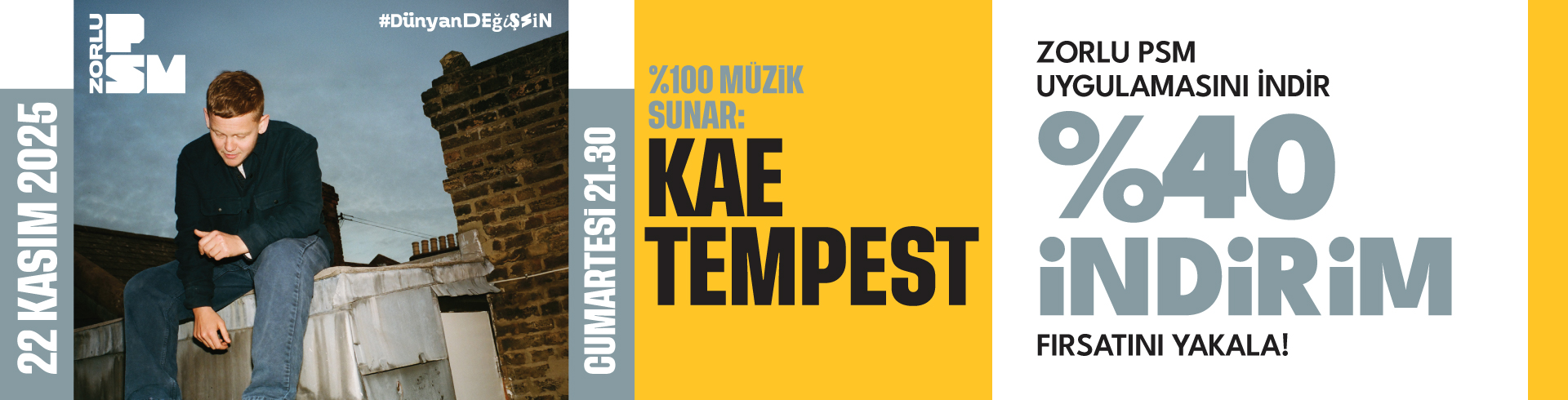 Zorlu PSM uygulamasını indir, kampanya kodunu aktive et ve 22 Kasım Cumartesi günü Turkcell Sahnesi'nde gerçekleşecek olan %100 Müzik Sunar: Kae Tempest konseri için %40 indirim fırsatını yakala!