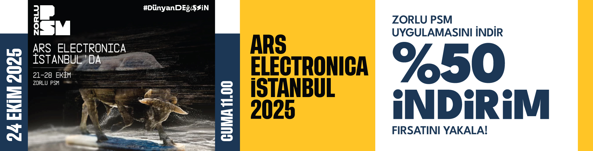 Zorlu PSM uygulamasını indir, kampanya kodunu aktive et ve 24 Ekim Cuma günü Zorlu PSM'de gerçekleşecek olan Ars Electronica İstanbul için %50 indirim fırsatını yakala!