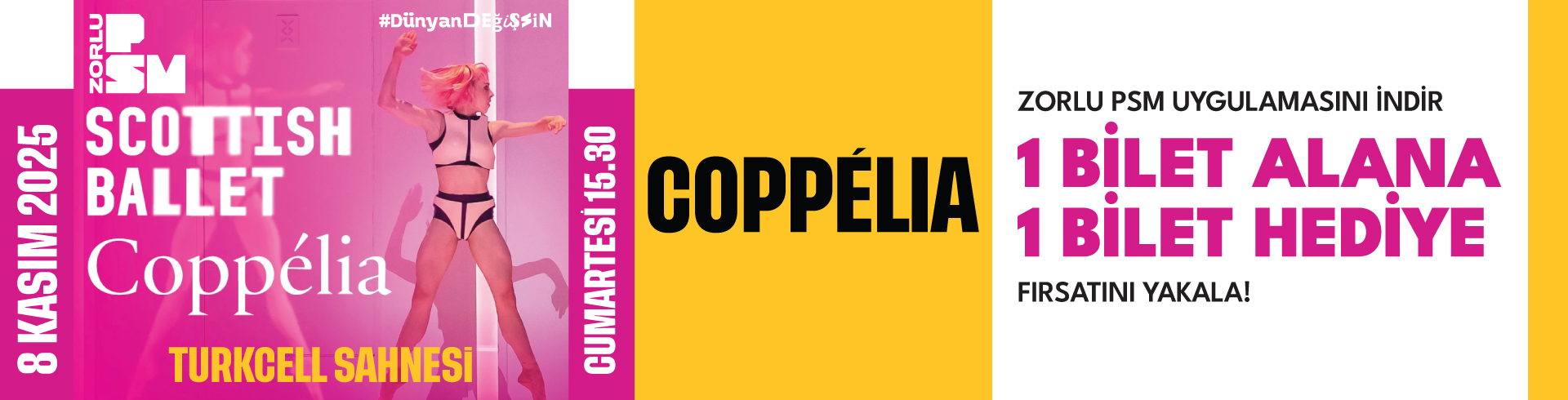Zorlu PSM uygulamasını indir, kampanya kodunu aktive et ve 8 Kasım Cumartesi saat 15:30'da Turkcell Sahnesi'nde gerçekleşecek olan Coppélia için 1+1 fırsatını yakala!