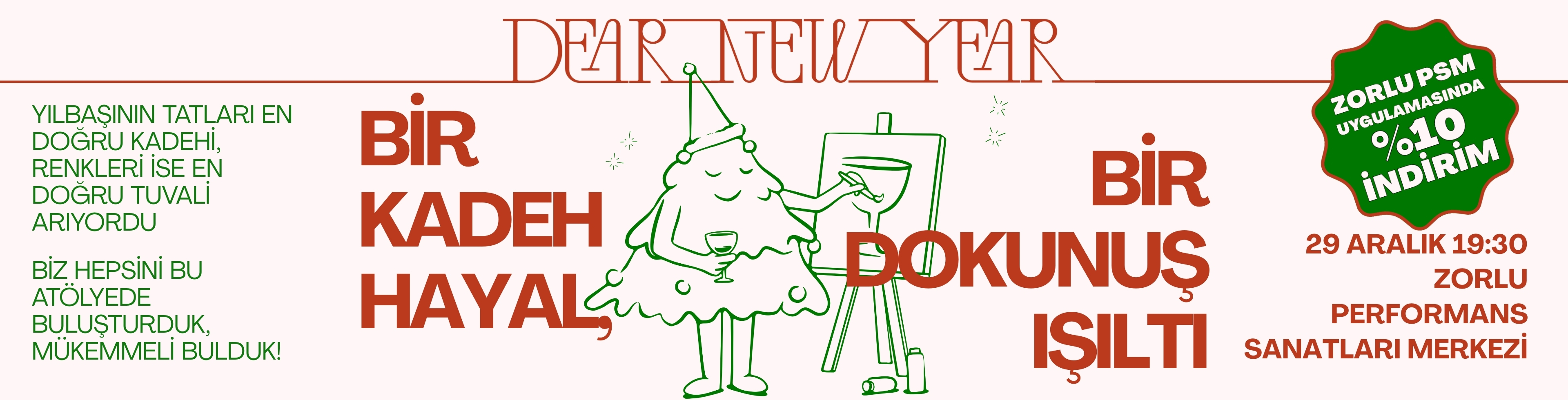 Zorlu PSM uygulamasını indir, kampanya kodunu aktive et ve 24 Aralık Çarşamba günü Zorlu PSM'de gerçekleşecek olan Dear New Year: Bir Kadeh Hayal, Bir Dokunuş Işıltı Atölyesi için %10 indirim fırsatını yakala!