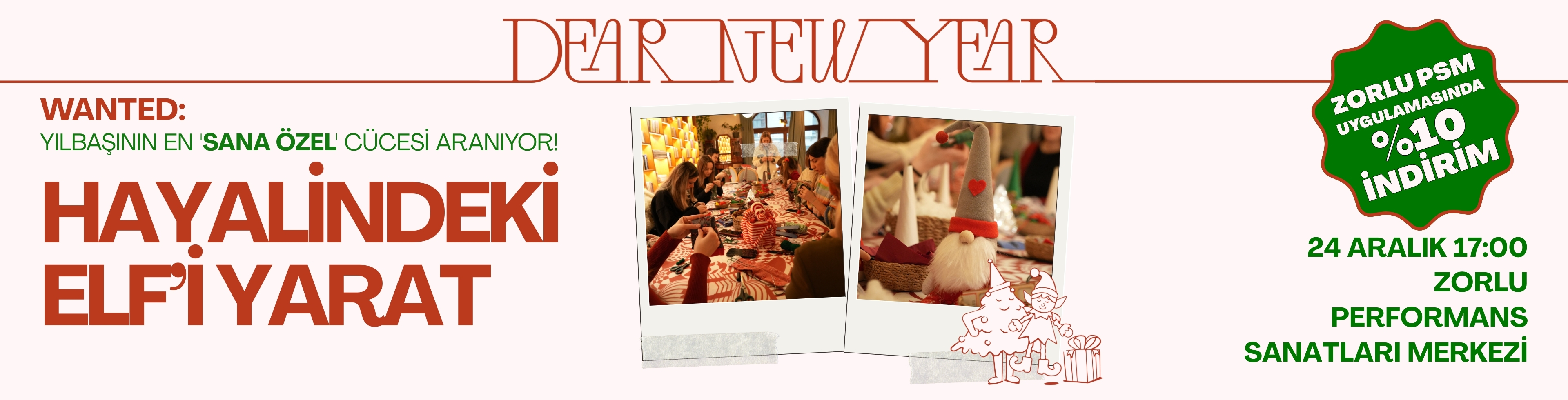 Zorlu PSM uygulamasını indir, kampanya kodunu aktive et ve 23 Aralık Salı günü Zorlu PSM'de gerçekleşecek olan Dear New Year: Hayalindeki Elf'i Yarat Atölyesi için %10 indirim fırsatını yakala!