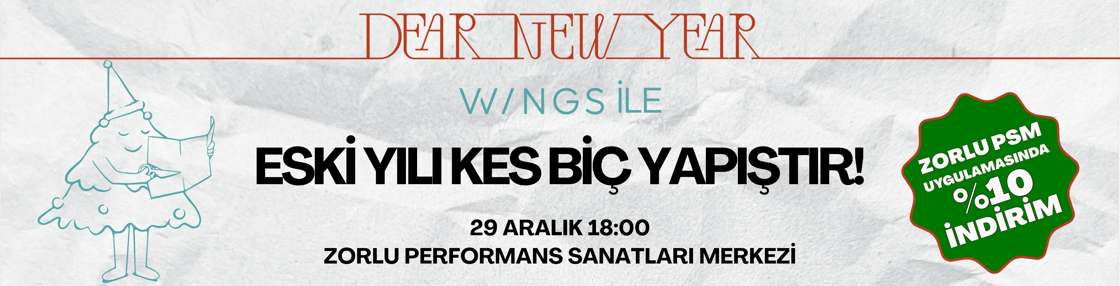 Zorlu PSM uygulamasını indir, kampanya kodunu aktive et ve 22 Aralık Pazartesi günü Zorlu PSM'de gerçekleşecek Dear New Year: W/NGS İle Eski Yılı Kes Biç Yapıştır Atölyesi için %10 indirim fırsatını yakala!