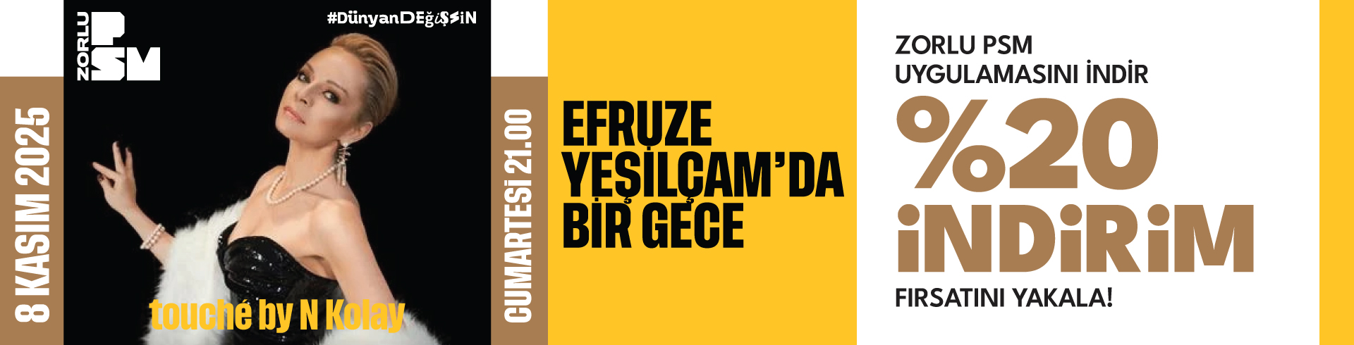 Zorlu PSM uygulamasını indir, kampanya kodunu aktive et ve 8 Kasım Cumartesi günü touché by N Kolay'da gerçekleşecek olan Efruze Yeşilçam'da Bir Gece konseri için %20 indirim fırsatını yakala!