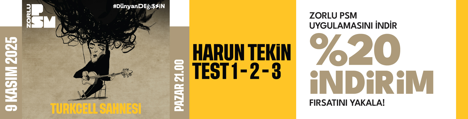 Zorlu PSM uygulamasını indir, kampanya kodunu aktive et ve 9 Kasım Pazar günü Turkcell Sahnesi'nde gerçekleşecek olan Harun Tekin Test 1 - 2 - 3 konseri için %20 indirim fırsatını yakala!