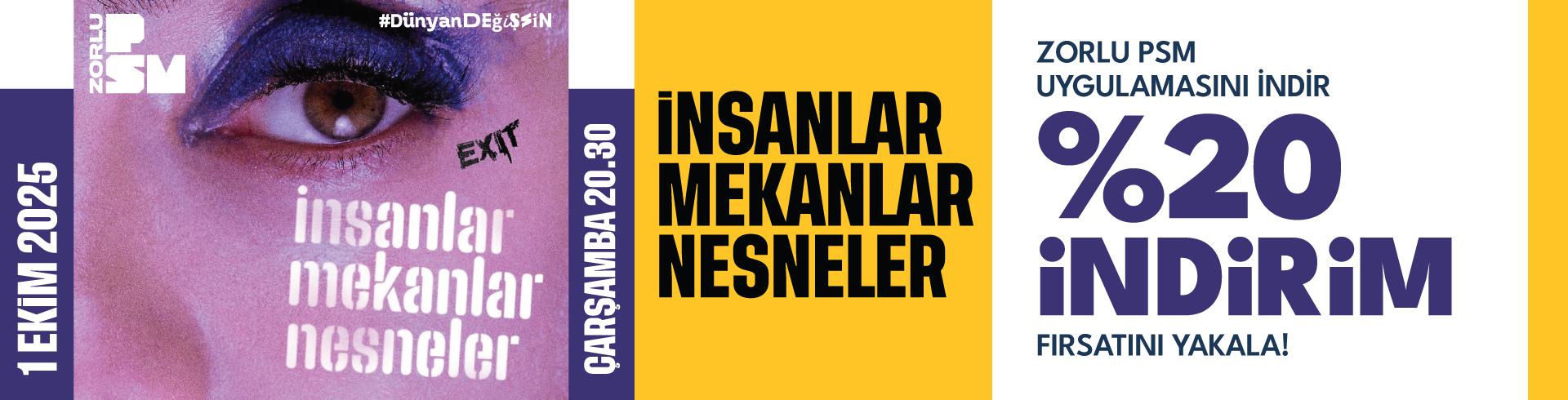Zorlu PSM uygulamasını indir, kampanya kodunu aktive et ve 1 Ekim Çarşamba günü Turkcell Platinum Sahnesi'nde gerçekleşecek olan İnsanlar Mekanlar Nesneler oyunu için %20 indirim fırsatını yakala!