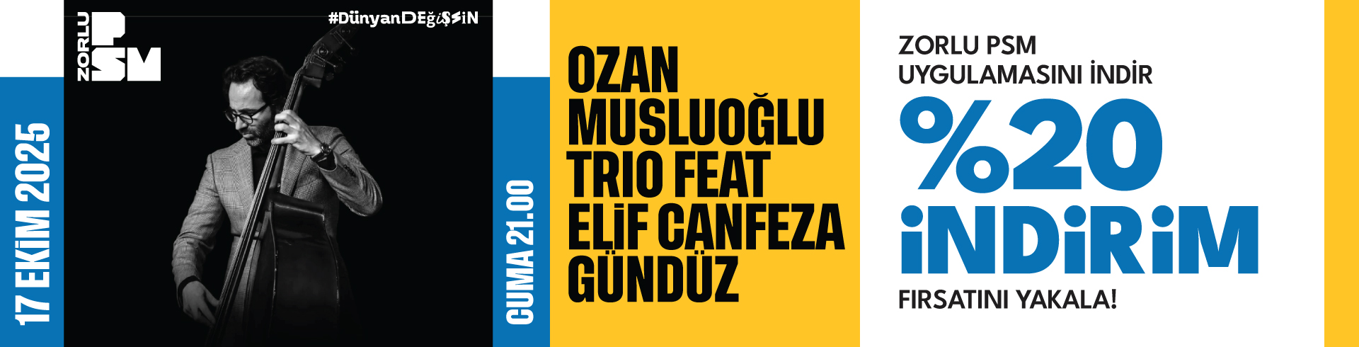Zorlu PSM uygulamasını indir, kampanya kodunu aktive et ve 17 Ekim Cuma günü touché by N Kolay'da gerçekleşecek Ozan Musluoğlu Trio feat. Elif Canfeza Gündüz konseri için %50 indirim fırsatını yakala!