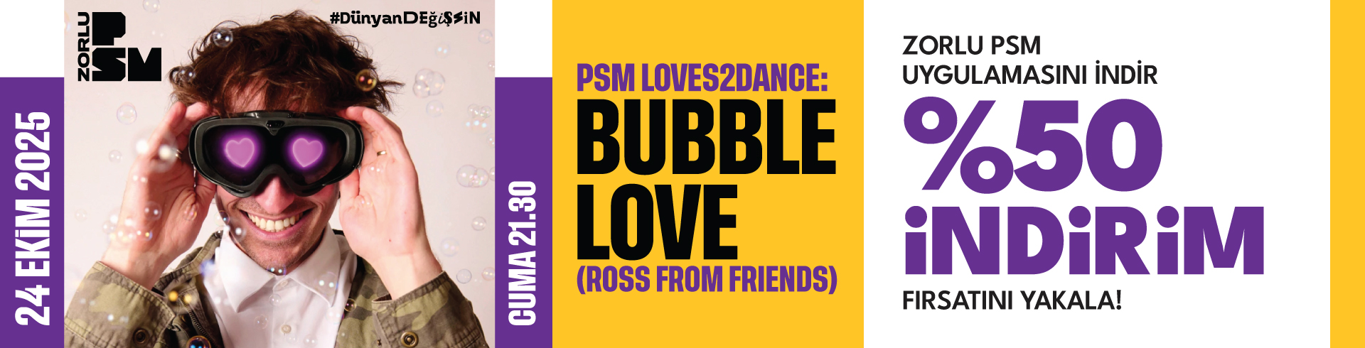 Zorlu PSM uygulamasını indir, kampanya kodunu aktive et ve 24 Ekim Cuma günü %100 Studio gerçekleşecek olan Psm Loves2Dance: Bubble Love (Ross From Friends) konseri için %50 indirim fırsatını yakala!