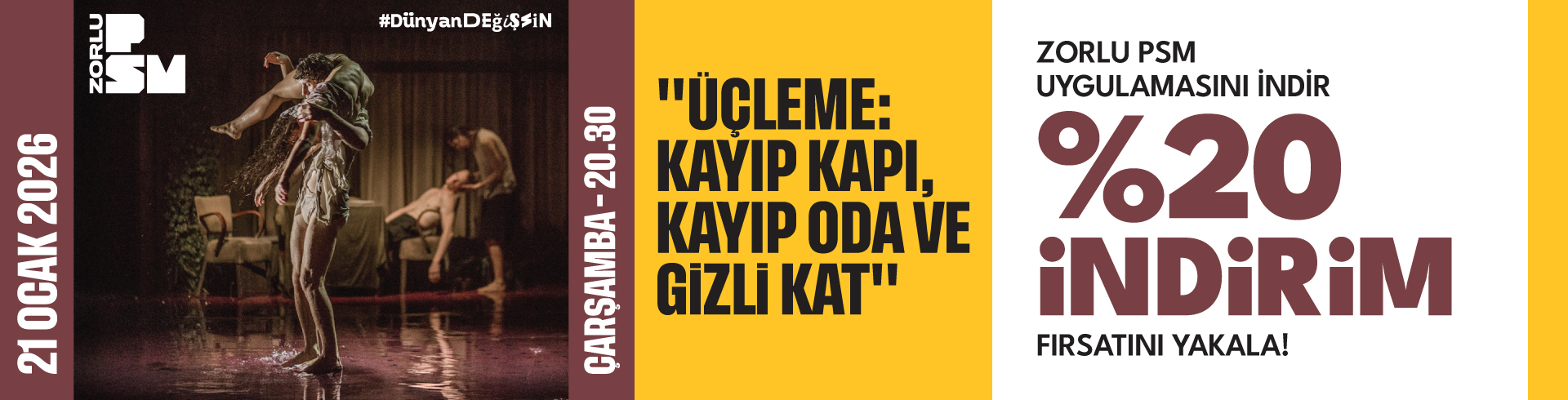 Zorlu PSM uygulamasını indir, kampanya kodunu aktive et ve 21 Ocak Çarşamba günü Turkcell Sahnesi'nde gerçekleşecek olan Üçleme: Kayıp Kapı, Kayıp Oda ve Gizli Kat için %20 indirim fırsatını yakala!