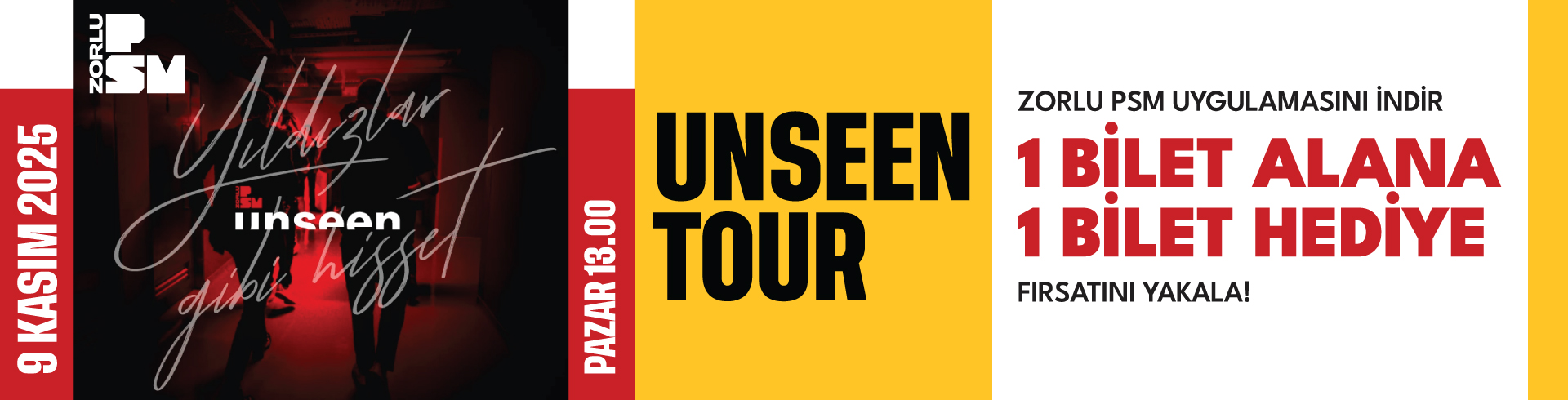 Zorlu PSM uygulamasını indir, kampanya kodunu aktive et ve 9 Kasım Pazar günü Zorlu PSM'de gerçekleşecek olan Unseen Tour için 1+1 fırsatını yakala!